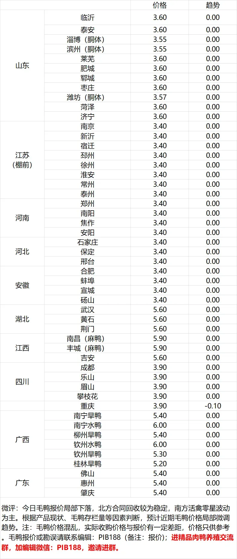 | 微评:鸭苗报价局部上涨。(注:南方只报当天价格)市场情绪一般,交投平淡。根据产品、养殖成本及鸭苗现状分析,预计近期鸭苗价格呈震荡微调趋势。种蛋报价稳定。温馨提示:该价格为主流厂家报价,实际销售价格以成交价格为准, |