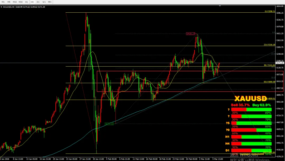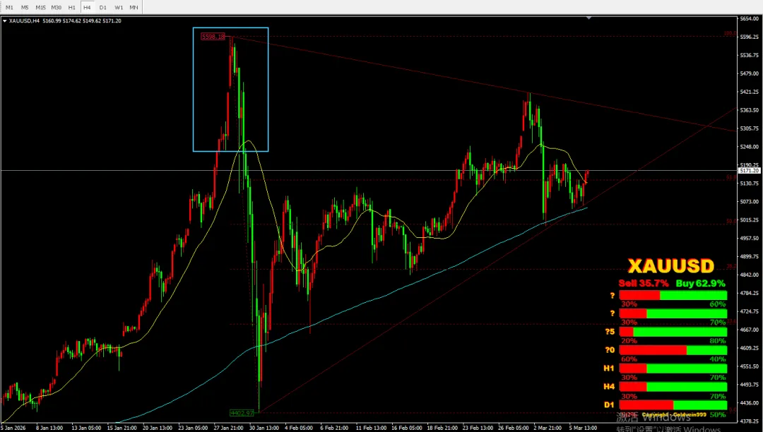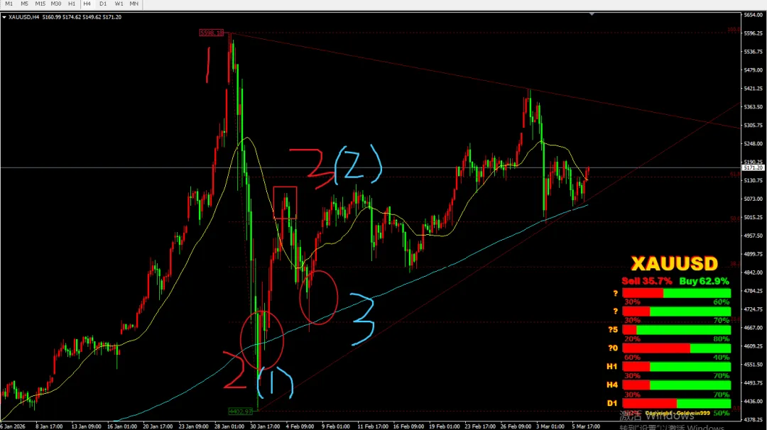 受美以伊战事影响,避险情绪带动,开盘跳空高开,但欧盘后,涨势衰竭,空头占优,美盘续跌,直到凌晨过后,修复缺口后,急促反弹,直到周二亚洲盘涨势衰竭,已吃掉周一的大部分跌幅,受阻后,欧盘再次进入跌势,美盘直接狂跌,势如破竹,直到接近凌晨跌势放缓,开始反弹。