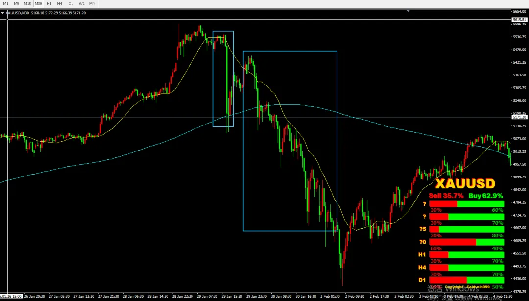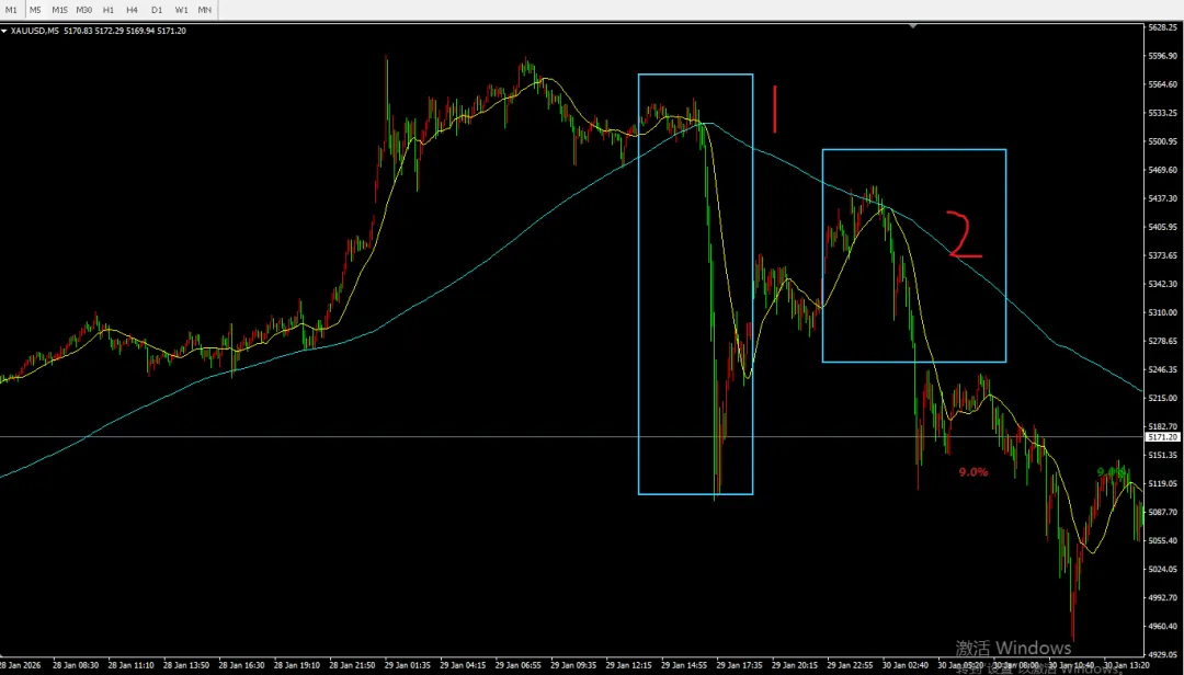 一天后黄金开始急拉后急促下跌,那天刚好是1月29号,那天美盘时间急促转跌,措手不及。我在顺势操作一波跌势,这波跌势只能在分钟图上才能明锐感知到。这波抓不到没关系,最厉害跌势是第二天反弹受阻之后,才是空头利润的狂欢。