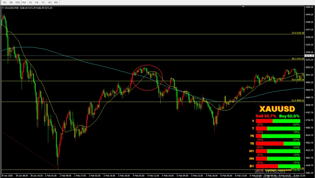 30分钟图:下方支撑做多这波,在黄金分割线50%之间,开始被21、200日均线压制,这时就可以离场了。
