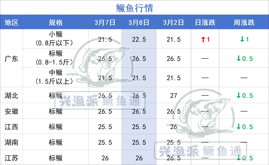 3月8日,广东小鳜涨1元/斤。