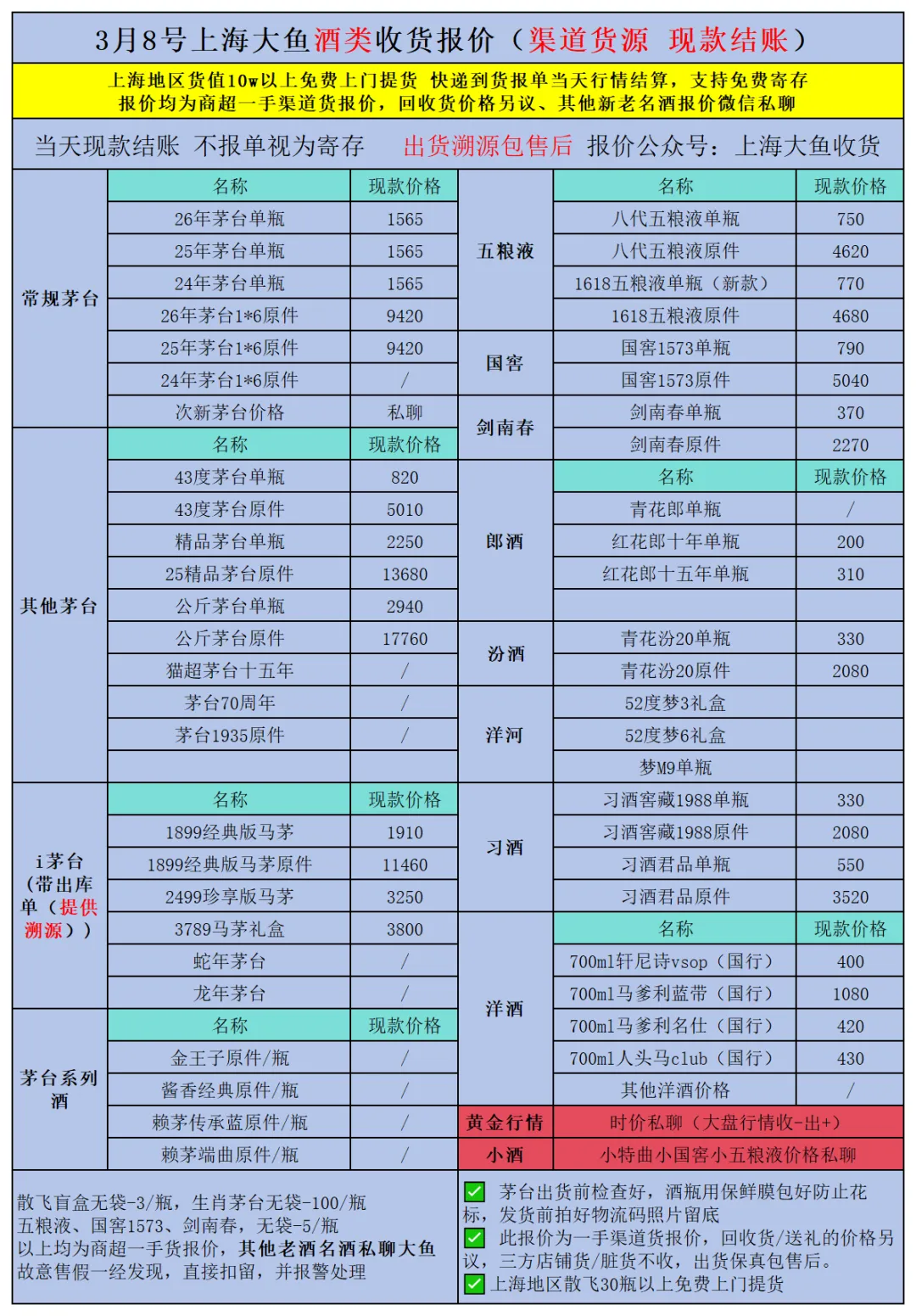 此报价为一手渠道货报价,回收货/送礼货价格另议,烟酒店回流货/三方店铺货/脏货不收,出货默认保真、永久溯源、包售后、故意售假扣货报警、不接任何国补货源
