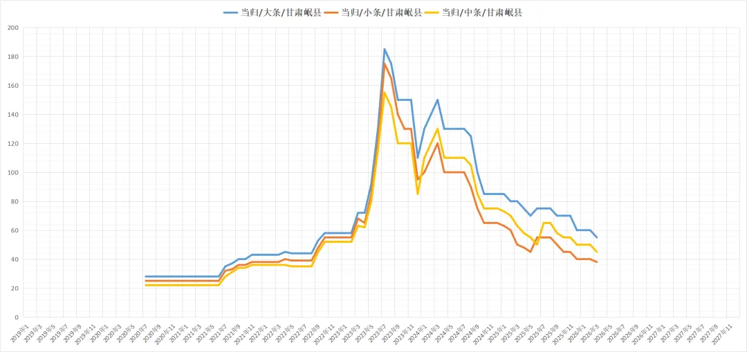 当归药厂成交价格30-33元/kg之间;当归小条成交价格35-40元/kg;当归中条成交价格在43-48元/kg;当归大条(条形好)成交价格在51-56元/kg之间;当归特大条(条形好)成交价格在62元/kg左右。以上价格仅供参考,具体以实际成交价格为主。