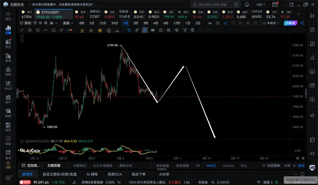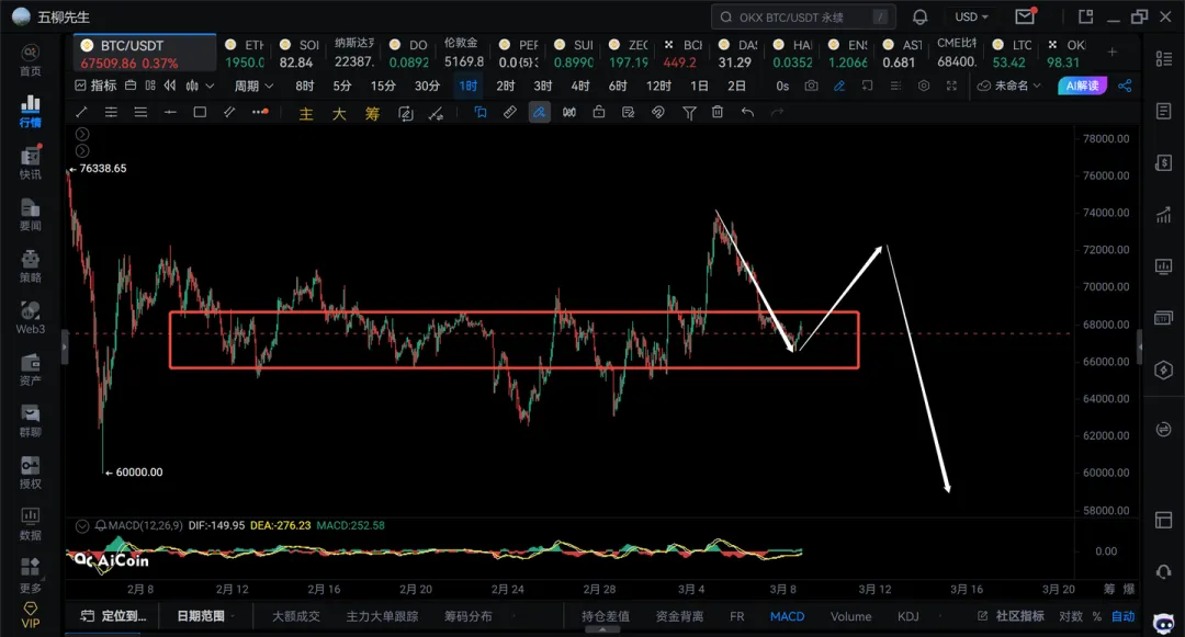 2)如果短线不能突破68500,则还需要注意可能还会回踩到66000附近,然后再开始1h级别的反弹