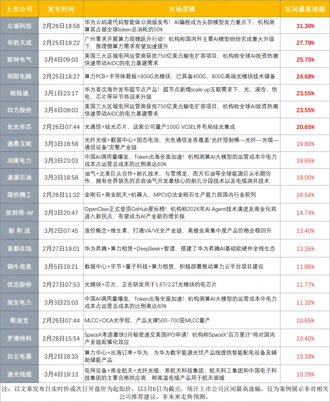 本文提及四方股份、海特光电,在电力设备板块走强背景下,均展现出强势上涨动能。截至3月6日收盘,区间最高涨幅分别达23.55%、25.75%。