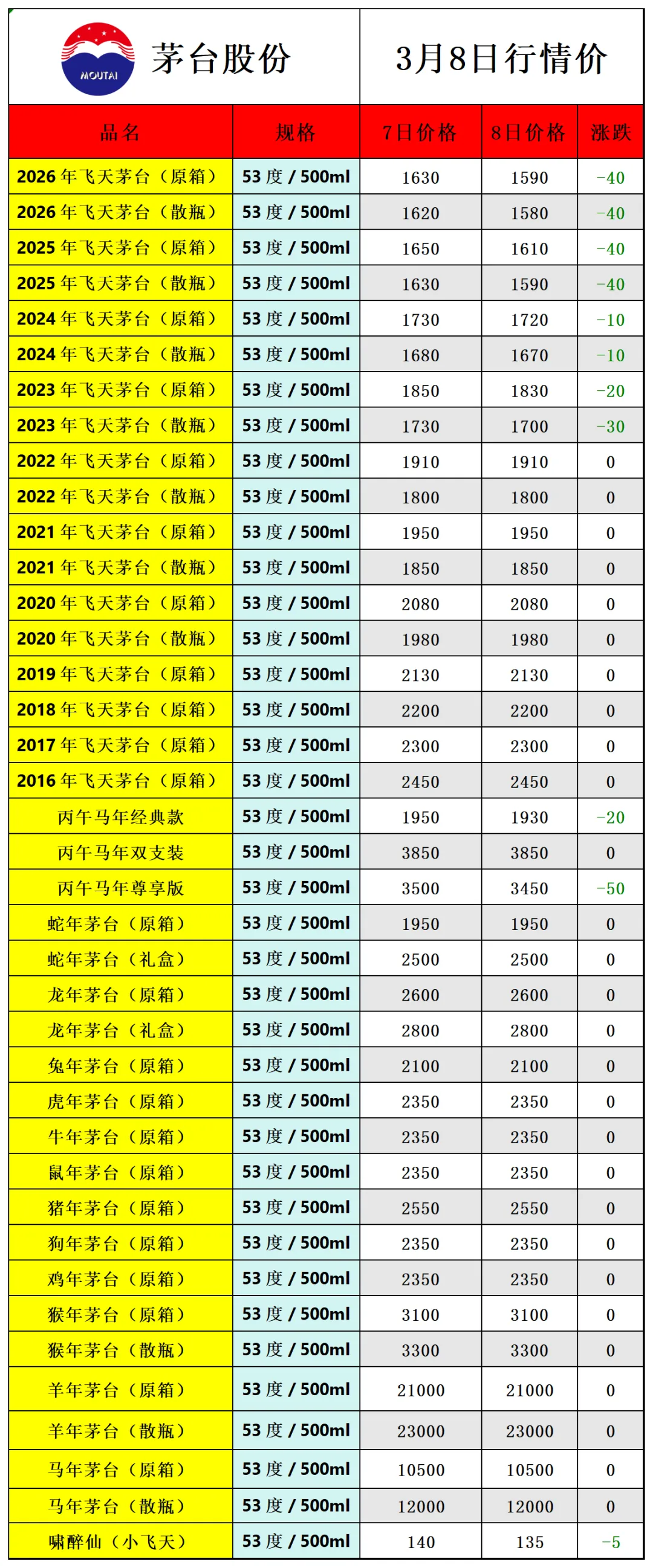 飞天大跌,茅台酒3月8日行情.