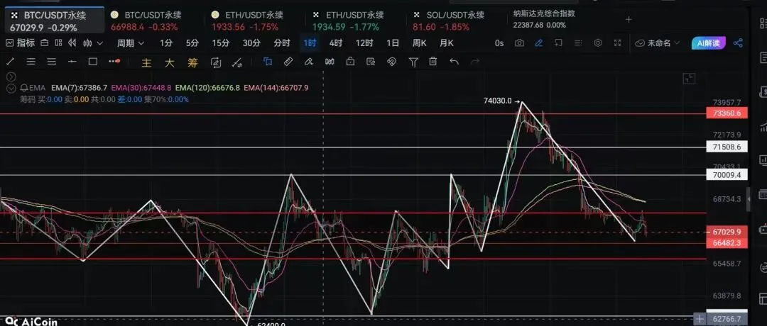 后市可微调,空仓66500一带即可多,保守65800中枢多。上方还会多次测试。先朝68200一带看吧。短期的高频震荡区,也会是66800-68500一带,中线看站稳朝上走,因为十一笔升级过的前四小时中枢,没有那么容易被轻易跌破的。由于一小时,四小时,十五分钟多道ema均线全靠近价格上方。很多人会过分悲观,这样就容易踏空。