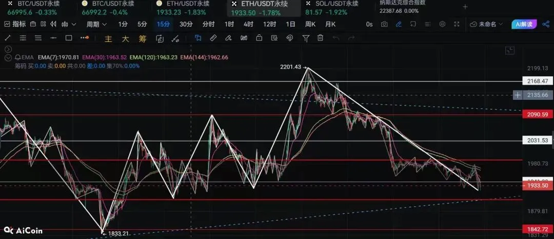 以太的波幅略急,朝下的动势急于大饼,这会给老操作手要泄一轮的感觉。但是不急不行,人均百倍杠杆起手的币圈,以太十多个点就能翻个小仓了,高频震荡的话,流动性会被量化蚕食。而形态上下方空间有限,如果插针下方空间很小,且会像数日前走一轮不错反弹。下方重点关注1905,上方重点关注1958,1986,2032。结构上反弹是优先级,以多为主上上选
