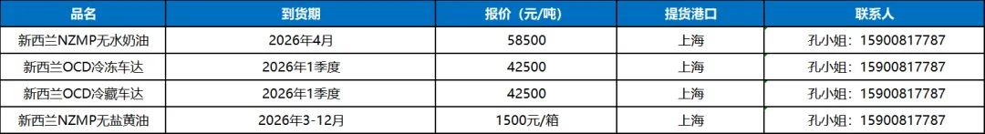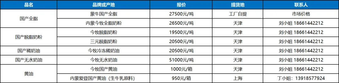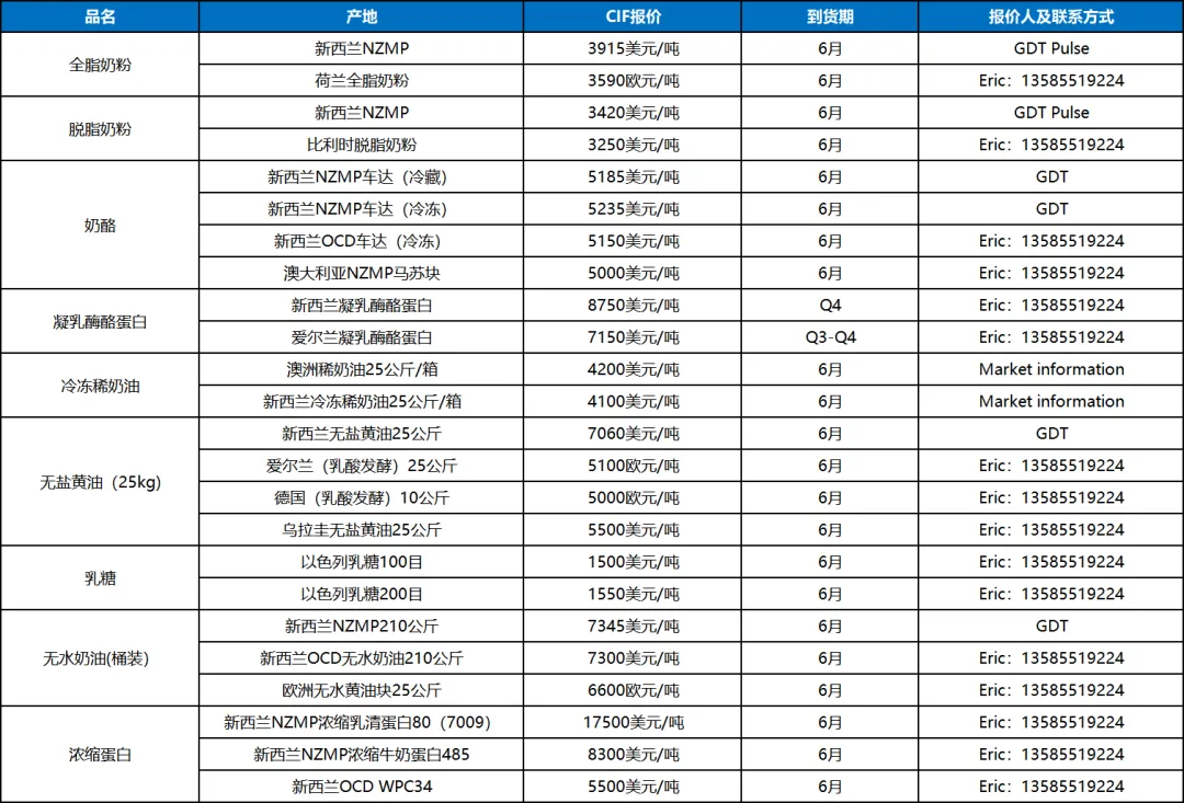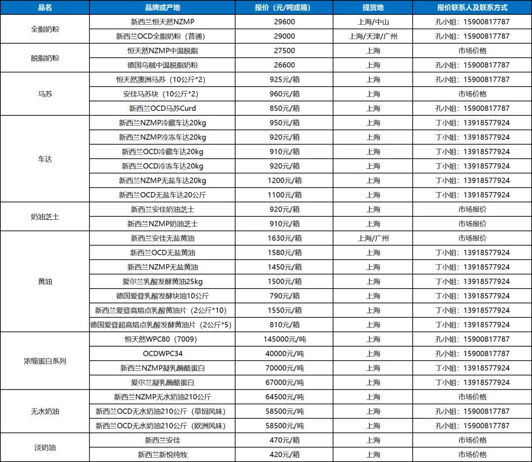 6. 新西兰主要厂家/产地动态:由于中东客户的发货受到地缘危机的影响,船运成本和周期大幅度上升,新西兰两大乳企和中东区域客户正进行紧密磋商后期奶粉订单执行问题;本产季两大乳企奶酪线下产量售罄,由于产季初奶源主要用于加工奶粉产品,新产季奶酪大概率到货时间将推迟至11月左右,预计品种价格持续上行居多。