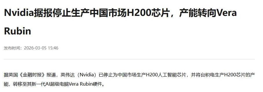 比如前两天路透社的一则消息,就值得细细琢磨:英伟达暂停台积电面向中国的 H200 芯片产量,同时将产能转向 Vera Rubin 芯片。