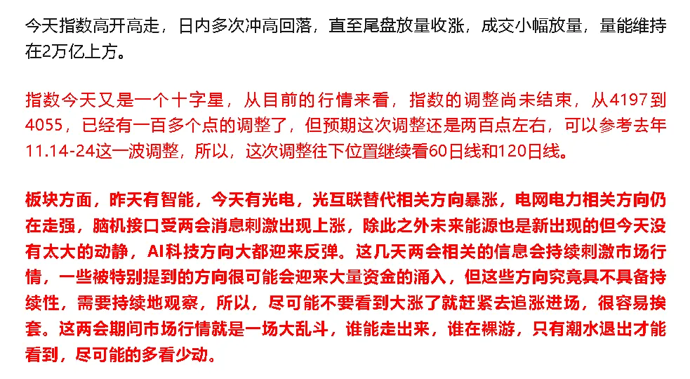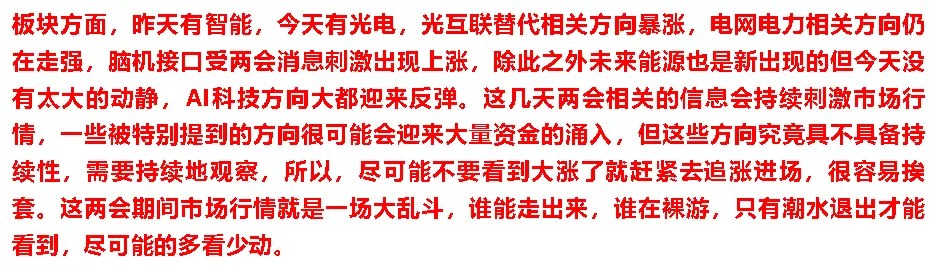 市场永远是对的,错误的是你的预期和策略,不要与市场争辩,而要与自己和解!!!周五指数低开低走,全天中小票强势,权重偏弱,尾盘缩量收跌,成交缩量,量能维持在2万亿上方。自地缘冲突以来,中小票便一直被吸血,一路下跌,周五终于迎来了大翻身,而权重也隐身了没有出来大规模吸血。但周末地缘冲突风险又激发,下周行情又会如何演绎?个人认为,指数肯定会有一定的影响的,但继续震荡调整的可能性比较大,同时指数往下的空间比较小,重点在60日线和120日线附近,所以指数若出现大幅调整,在60日线和120日线附近,机会大于风险。中小盘周五大翻身,受周末地缘风险影响情况下,下周大部分会继续震荡调整,小部分资金强烈认可的、两会消息刺激或业绩超预期会继续往上;权重方向,更大可能是原油和化工方向强势,本质上来说是涨价题材方向会比较强势很多。板块方面,受两会消息刺激和地缘风险影响,资金轮动会比较快,策略还是和上周说的一样。一、产业投资:百亿级项目频出,瞄准AI、光伏、半导体