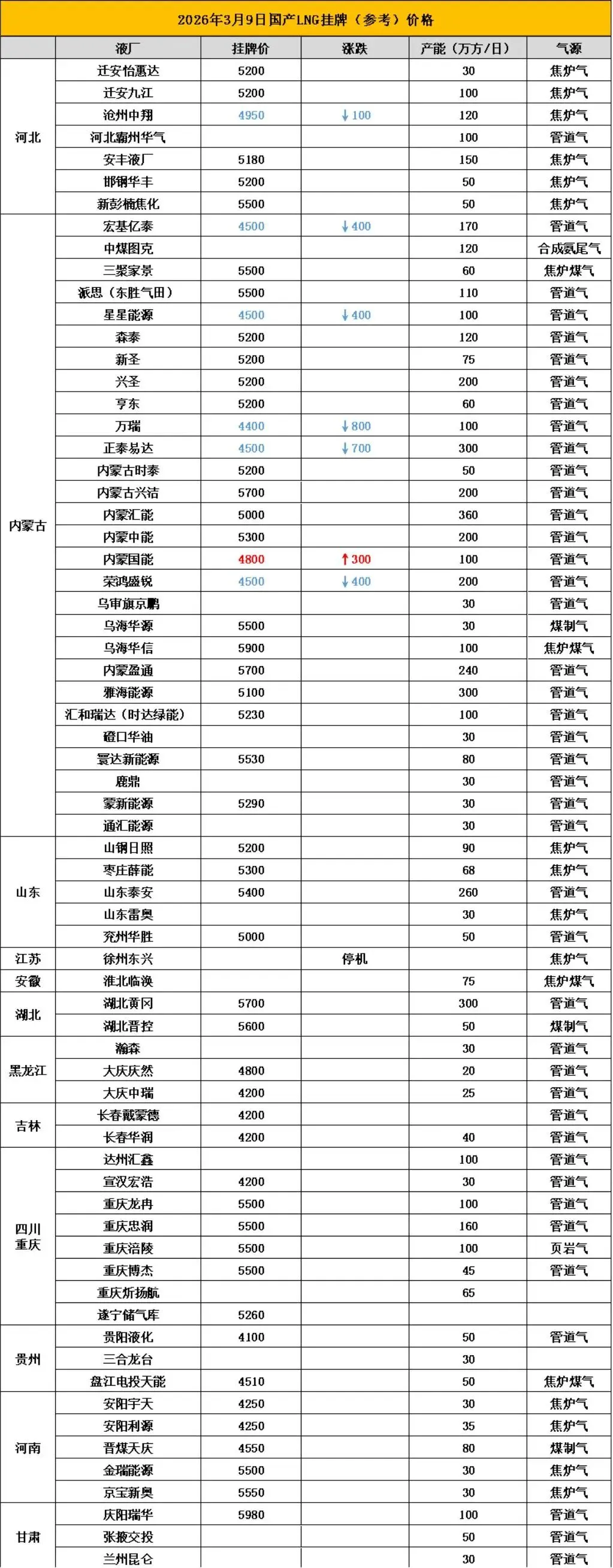 终端高价抵触情绪集中爆发,国产气市场迎来大幅下调,陕蒙等地液价回落100-800元/吨,与此同时,中东局势升级引发供应担忧,接收站资源减供、限量出货,海气价格逆势集体推涨,市场呈现“陆跌海涨”德极端分化格局,短期供需错配矛盾加剧,预计区域价差将进一步拉大。