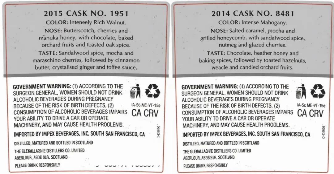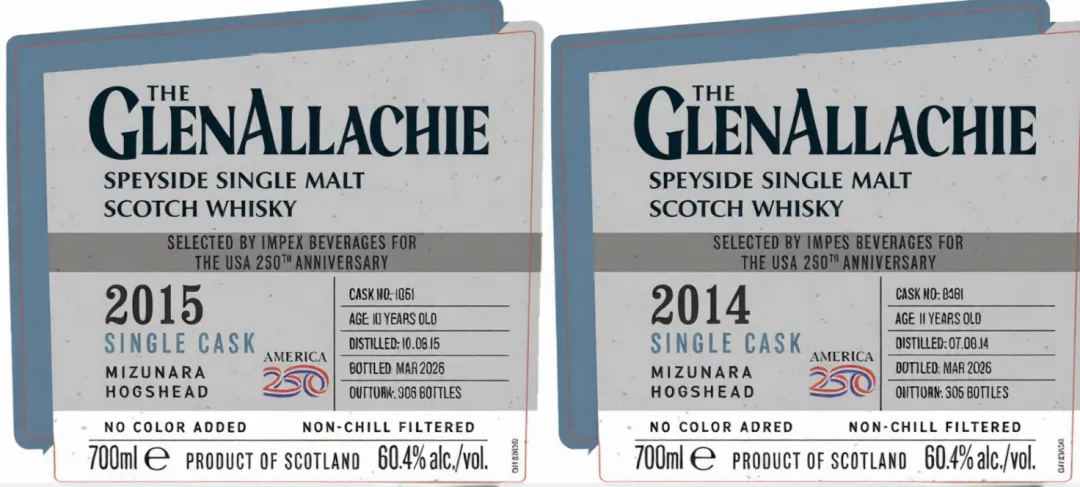 格兰纳里奇 2024 年 10 月推出超高端木匠大师(Masters of Wood)系列,首款为 17 年水楢 & Oloroso 雪莉桶款。近期在美国 TTB 数据库曝光该系列第二款:格兰阿拉奇 19 年 索莱拉雪莉桶,酒精度50%。格兰纳里奇曝光两款全新美国 Impex 定制单桶威士忌,为纪念《独立宣言》签署 250 周年推出,均带America 250标识,且均为水楢猪头桶熟成,属官方装瓶中少见版本。两款均为非冷凝过滤、无色素添加,2026 年 3 月装瓶。