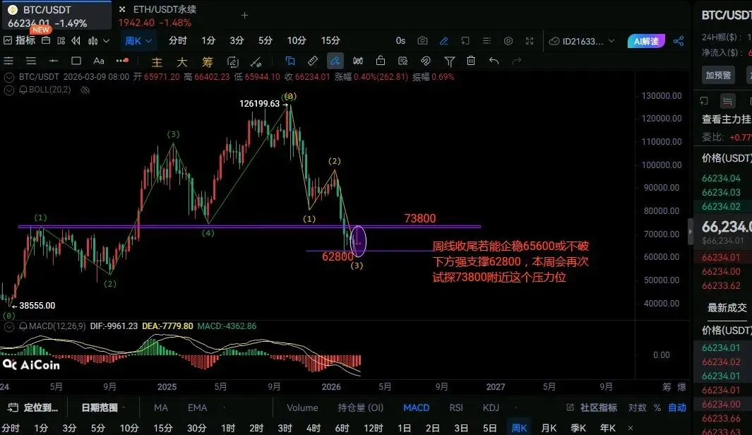 比特币(BTC)短期行情分析从周线看当前价格在66200附近,周线收尾若能企稳65600或不破下方强支撑62800,本周有望再次试探73800附近压力位;若有效跌破62800,空头趋势将延续。日线级别MACD绿柱缩短显示下跌动能减弱,但RSI仍在50下方,反弹力度有限。