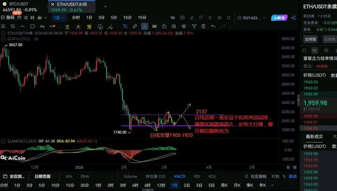 以太坊(ETH)短期行情分析技术面日线级别看价格在1900-2137区间反复震荡,近期在1900-1960区间横盘整理,MACD在零轴下方运行,RSI处于超卖区间,短期有反弹需求但力度不足。