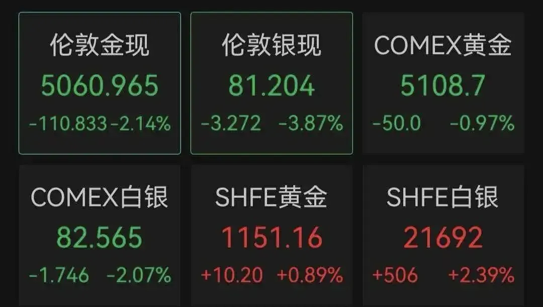 3月9日,黄金、白银盘中跳水。截至发稿,现货黄金日内跌超2%,报5060.965美元/盎司,现货白银跌3.87%,报81.204美元/盎司。