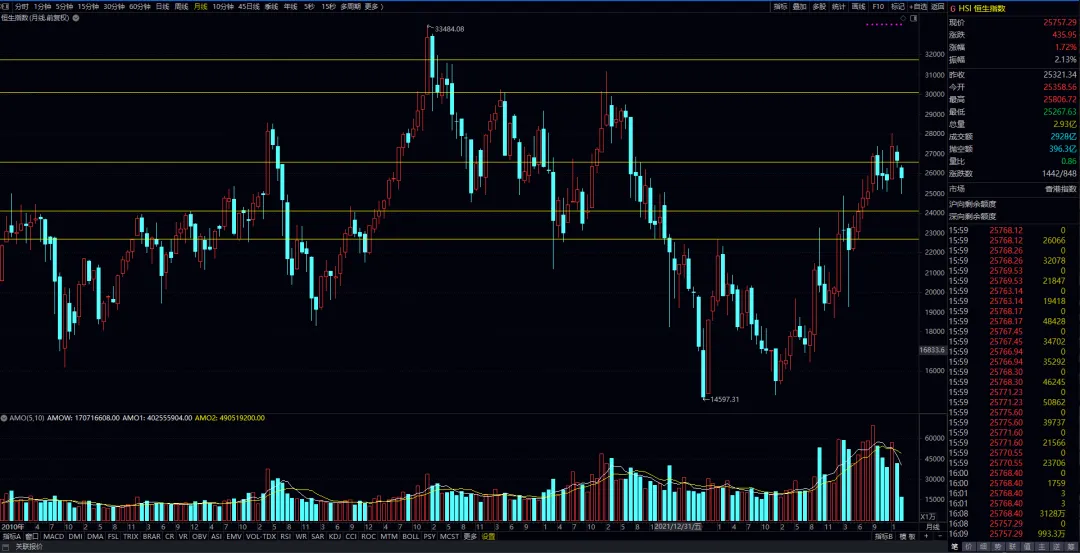 恒生指数月线图,《22800-24000-26500-30000-》32000。月结构图表上走势为持续加速后的振动阶段走势,波动率较大,注意跟踪24000上方指数变动情况即可。