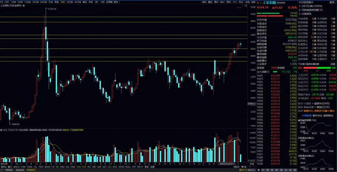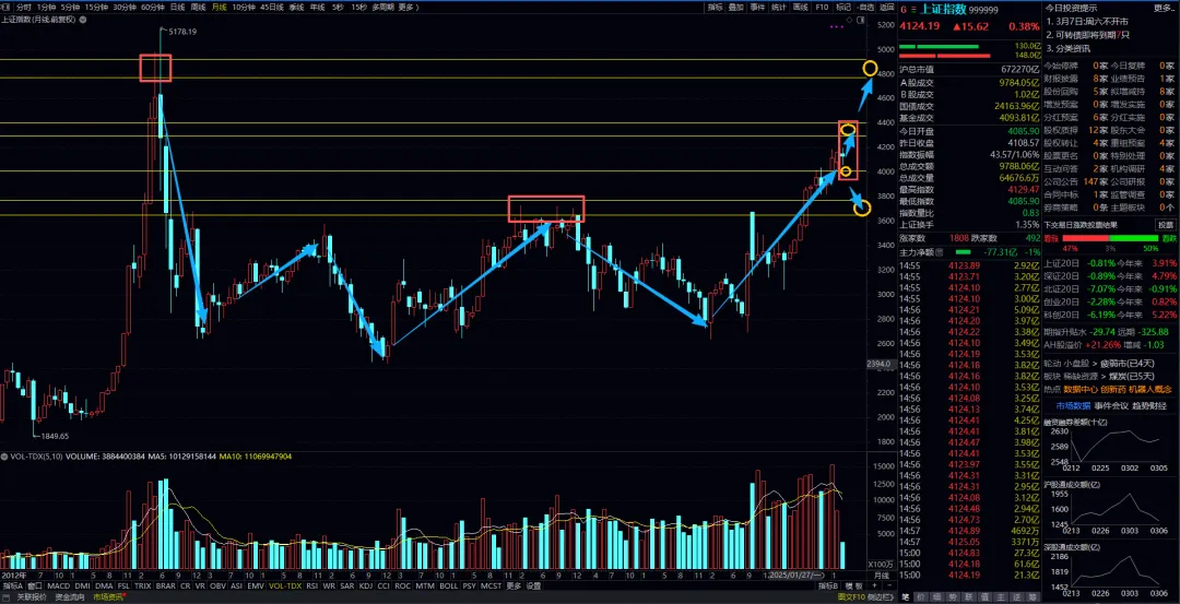 上证指数月线标注图,3630-《3780-4000-4300-4400-》4800。月结构图表上趋势在3780上方维持稳中偏强走势,4000为平衡位置,目前阶段指数运行速度会加快,波动率也会相对放大。