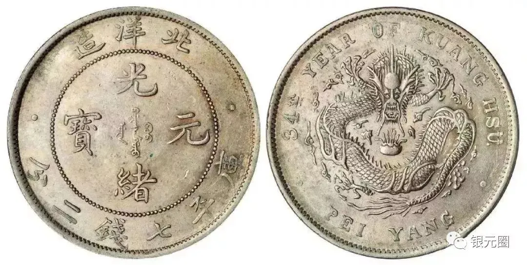 光绪元宝,北洋34年:通货品相3600元左右,美品4000+。热门品种。