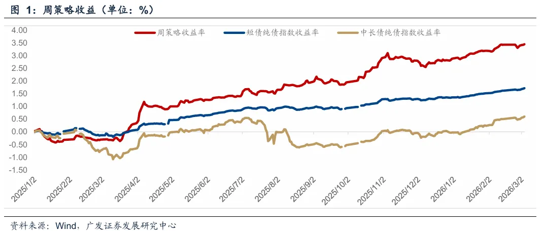 2025年初至今,周策略累计收益3.45%,跑赢短债纯债指数的收益率1.72%,以及中长债纯债指数的收益率0.61%。