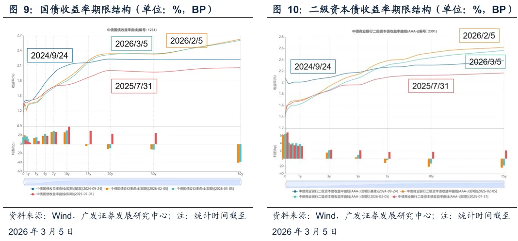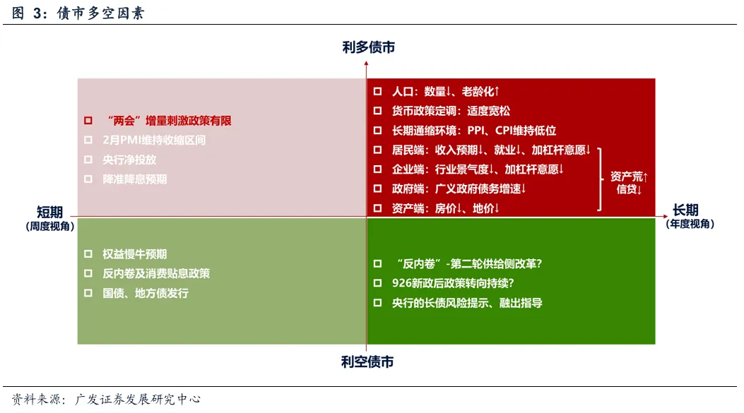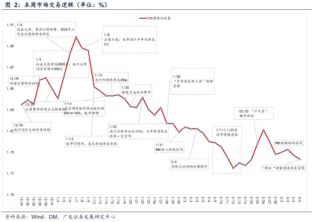本周市场主要交易三条逻辑主线:一是“两会”增量刺激政策有限,政策克制基调得以确认;二是银行负债成本下行预期显著升温,叠加月初资金面平稳宽松,带动短端品种领涨;三是2月PMI仍处收缩区间,基本面修复节奏偏缓,为债市提供边际支撑。
