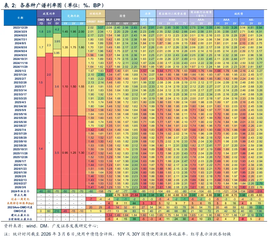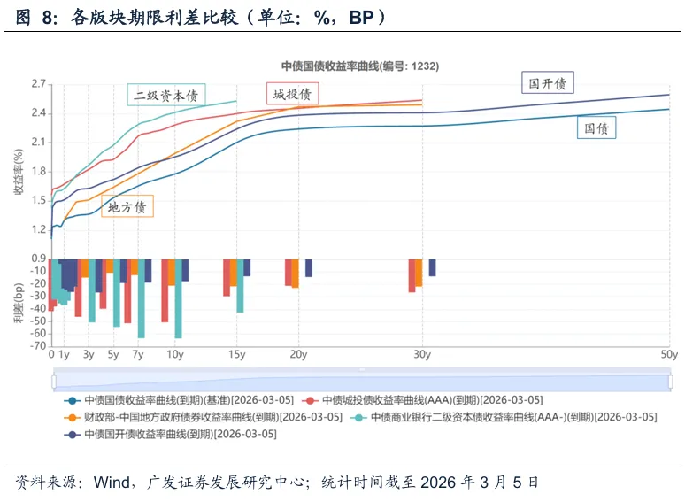 从曲线形态来看,2年地方政府债存在凸点,与国债利差达14bp;4年AAA-二级资本债和AAA城投凸点较为明显,适合骑乘策略,目前与同期限国开利差分别为31bp、23bp。同时,结合广谱利率来看,7Y高等级二级资本债距离止盈点位仍有30bp,适合风险偏好较高的投资人。