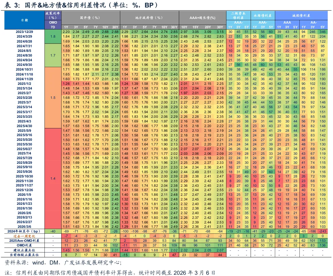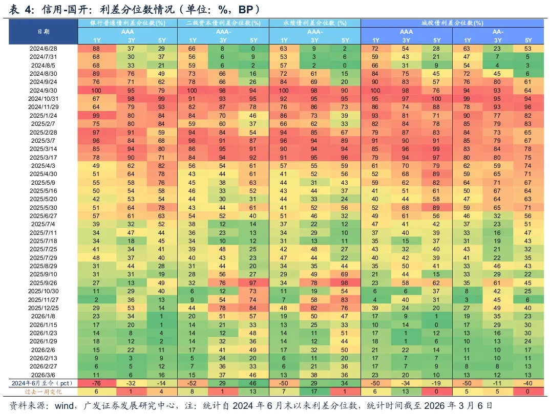 债市定价或有错位,短端博弈空间有限。1年期国债点位已处于偏低水平,与DR007利差已行至相对极致的区间,短端定价与资金面或有错位,反映出市场可能在透支宽松预期。当前1年期AA-城投债收益率已低于前期止盈点位约8BP,1-5年期城投债距离止盈点位也收窄至10BP以内,进一步博弈的空间已十分有限。