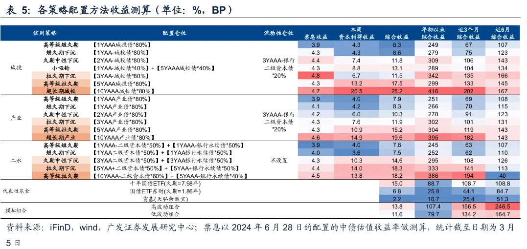 根据债市各类因子及市场偏好特征构建了城投、产业、二永债的典型组合,以观察各类策略的整体综合业绩情况。本周截至3月5日,城投和产业均以超长期策略相对占优,二永拉久期下沉策略具有相对优势。模拟组合来看,本周高波动组合相对占优。