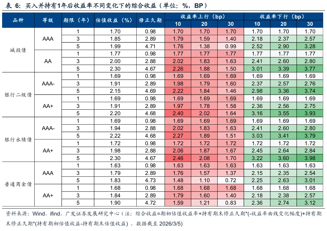 以2026/3/5收益率为基准计算持券1年的综合收益,3~5年二永债性价比较高,下滑回报可以适当对冲小幅利率上行。