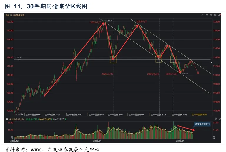 交易逻辑转变:由债牛思维转向“宏观预期好转+权益牛市信心增强”。 2025年3月和9月TL两度挑战却均未向下突破支撑位(113.5),反映彼时债牛思维惯性仍存。12月TL有效下破,或隐含其中长期交易逻辑转向“宏观预期好转+权益牛市信心增强”。