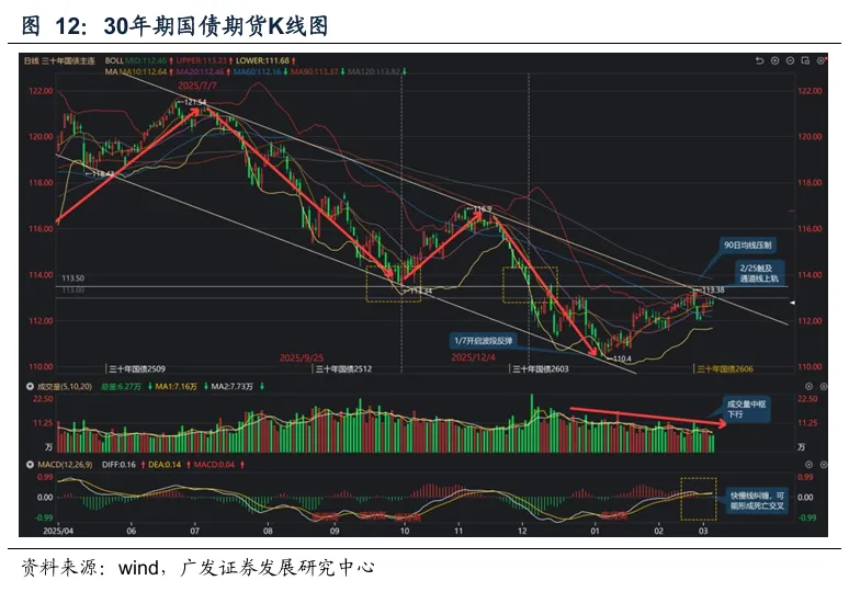 TL合约震荡偏谨慎:1.量能持续下行,突破动能不足:波段反弹自1月7日开启,迄今成交量中枢持续下移,指向突破动能不足。2.上方阻力位约束强:下行通道线上沿/90日均线/布林带上轨构成多重阻力带。2026年2月25日主力合约TL2606价格(113.38)触及下行通道线上轨及布林带上沿后回落,未能有效突破。目前价格再度接近触及通道线上沿,同时上方面临90日均线/布林带上轨多重阻力带,突破难度高,触及阻力线可能出现技术性回调;3.MACD线接近死亡交叉:近期MACD线纠缠,可能形成死亡交叉,短期偏谨慎看待。
