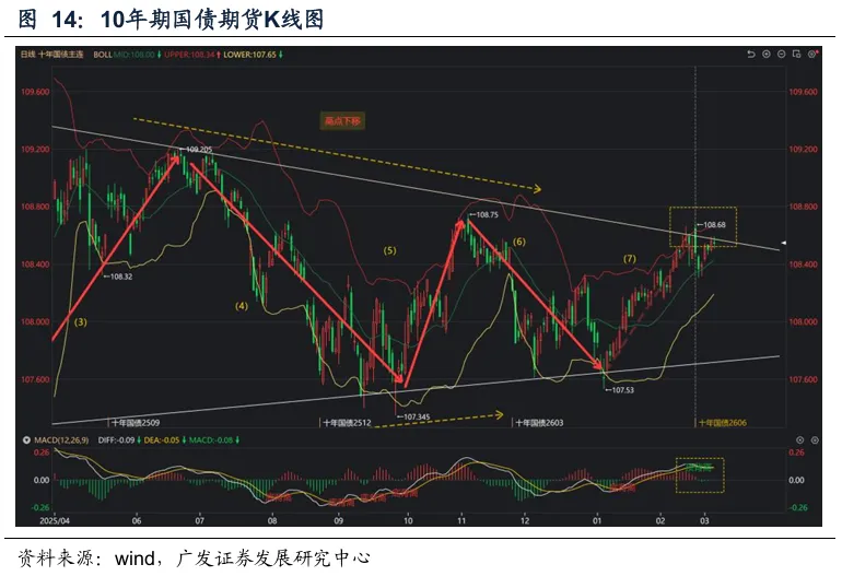 T合约震荡略偏谨慎:1.上方阻力位约束强,难有效突破通道线/布林带上轨:部分受到移仓换月(主力合约切换至T2606)影响,2月25日T主力合约T2606价格高点及至108.68,短期突破楔形整理通道线上沿/布林带上轨,随即转为下行后震荡。目前价格再度触及通道线上轨,有概率出现技术性回调。2.MACD线形成顶背离+死亡交叉,短期仍然偏谨慎看待。