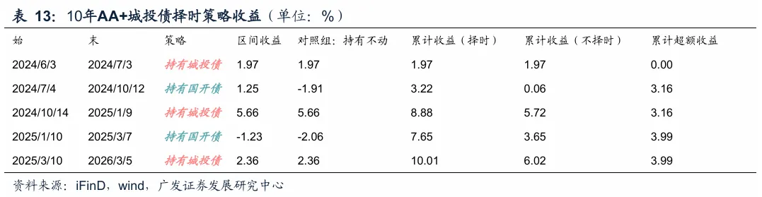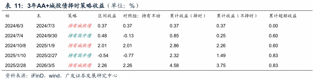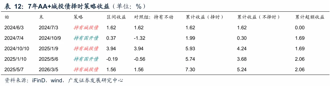 历史择时超额:根据这一策略,去年630以来7年和10年城投债历史择时超额为2.06%和3.99%。