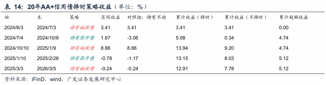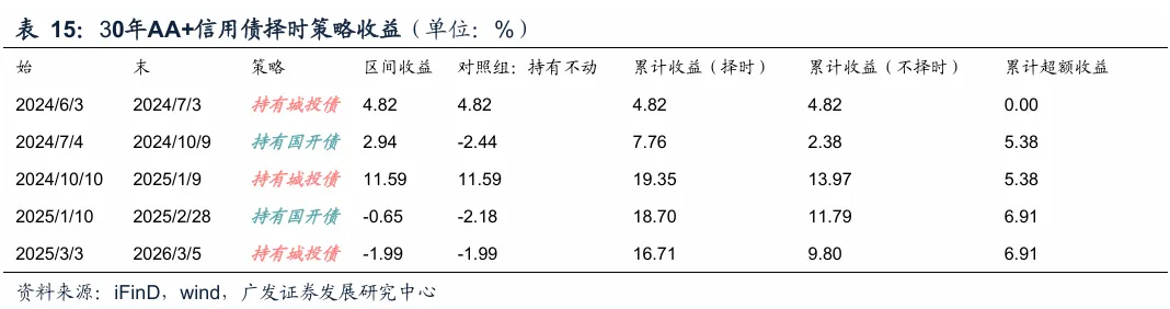 历史择时超额:根据这一策略,去年630以来20年和30年信用债历史择时超额为5.12%和6.91%。