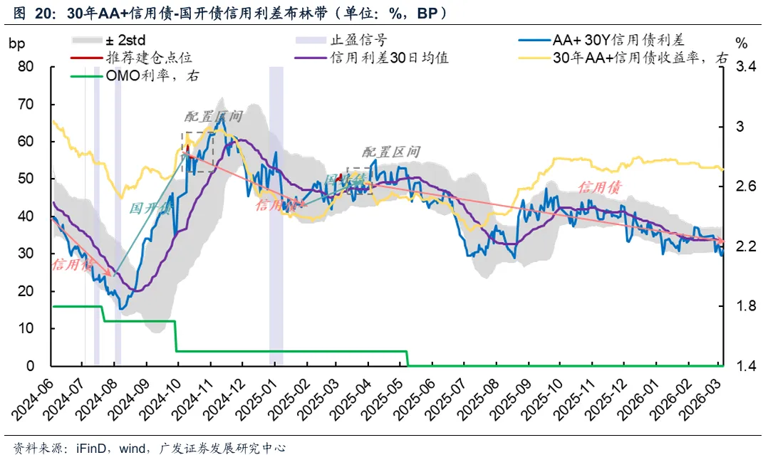 当前信号:20年AA+信用债在中轨附近,30年AA+信用债利差均已触及下轨,建议谨慎参与。