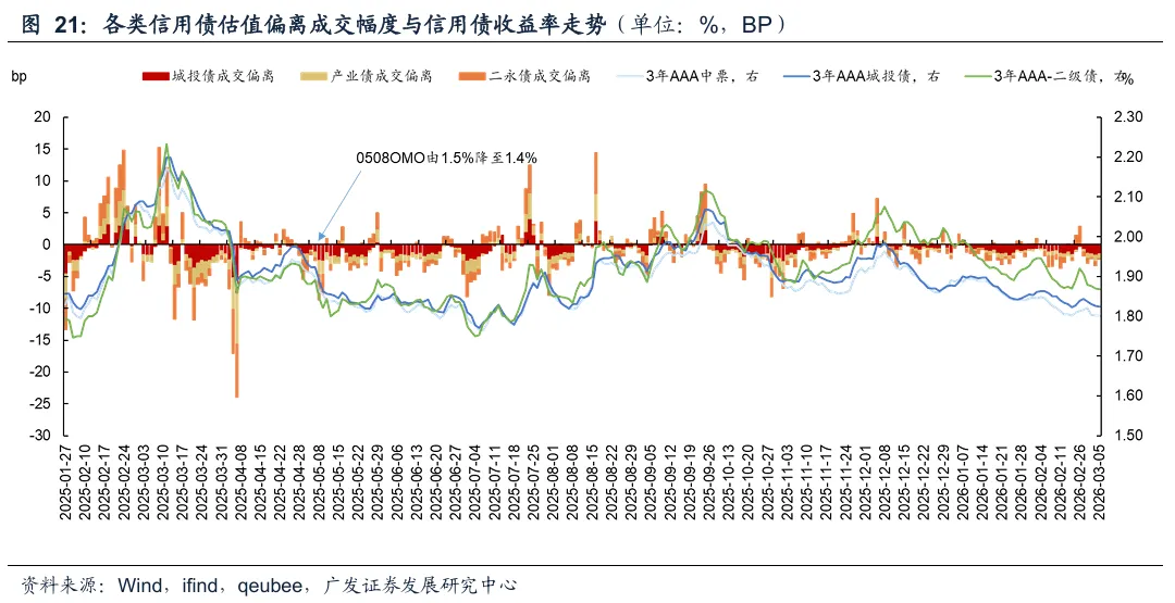 二永债估值偏离成交幅度大致领先信用债收益率1-3个交易日。复盘来看,2024年630以来这一指标曾三次领先:2024年9月26日,二永债偏离估值成交幅度相比9月25日提升接近5bp,随即9月27日信用债出现较大调整;10月9日二永债偏离估值成交幅度相比10月8日下降5bp,次日信用债开启修复行情;2025年1月2日-1月3日二永债偏离成交幅度连续大幅上行,3个交易日后信用债市场出现由负carry主导的调整行情。