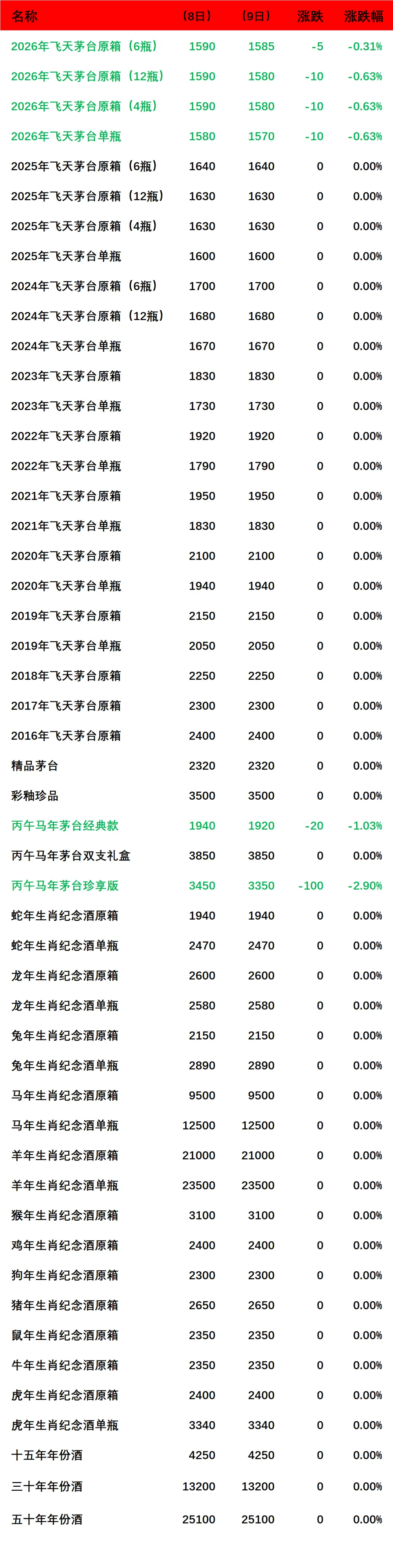 2026年飞天茅台(4瓶、6瓶和12瓶)原箱和单瓶,丙午马年经典版和丙午马年珍享版等产品出现下跌;