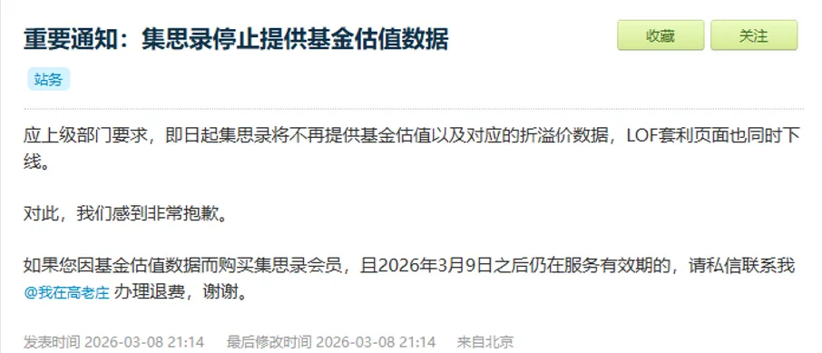 还值得关注的是昨晚(3 月 8 日),集思录发了通知:按监管要求,即日起全面停止提供基金估值、折溢价等数据,咱们平时套利最依赖的 LOF 折溢价查询、套利页面,全都一刀切没了。