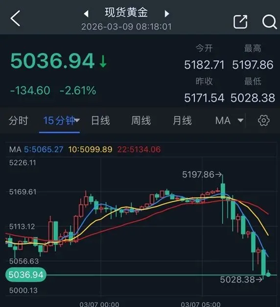 现货黄金价格最低跌至5028.38美元/盎司。目前金价位于5037美元/盎司附近,日内暴跌近135美元。