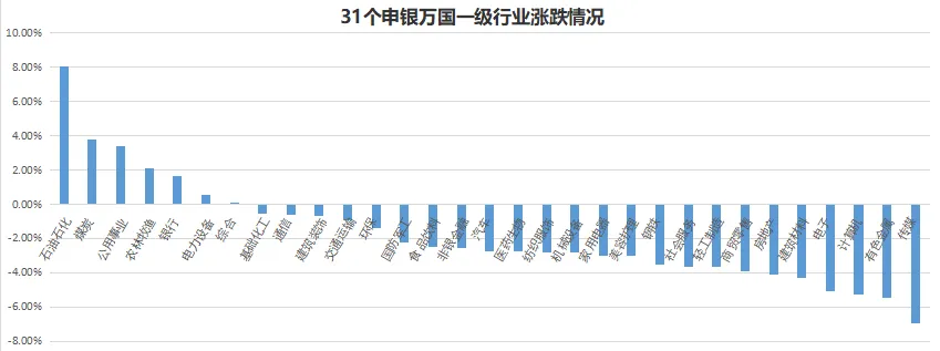 近五个交易日31个申万一级行业板块多数下跌。其中石油石化、煤炭、公用事业涨幅居前,传媒、有色金属、计算机跌幅居前。