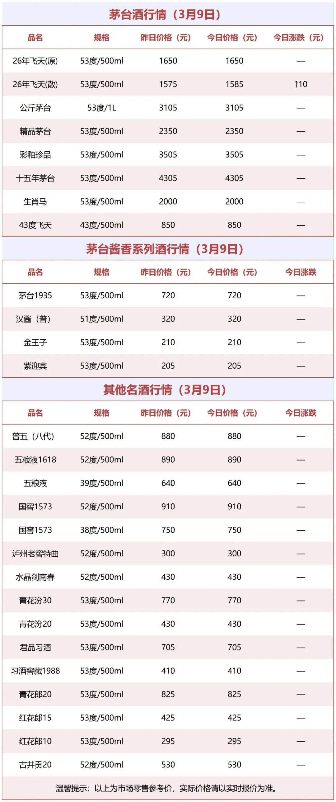 【茅台酒2026年3月9日行情价】飞天下跌!