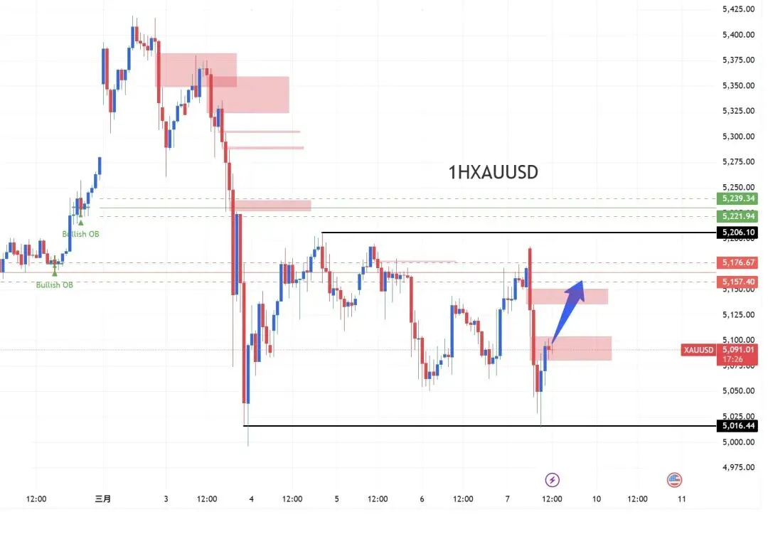 中东开战后,市场一面倒看多黄金,但金价没有单边起飞,而是在高位进入大震荡。周线收阴,黄金多次冲高至 5190 一带就被压回,5190–5226 已形成明显压力区,有机会演变成大平台。本周暂视为高位震荡+调整行情,只有有效突破 5226,才有空间再看新一轮大多头。