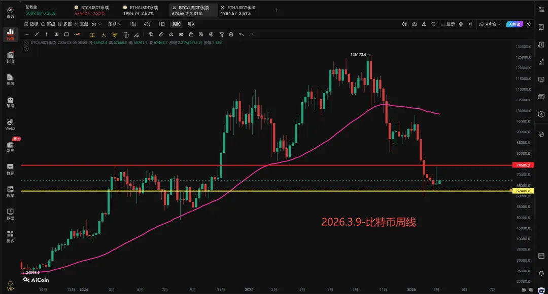 今天周线收盘,我们看周线,上一周收了一个倒垂线,一般来讲,这种低位的倒垂线后期看涨,目前的格局空间刚好也是之前牛市的起点,也是筹码密集区,这种形态不会大跌,62400~60000就是底部,75000附近就是顶部,这个区间的震荡会比较多,时间也会比较长,大涨也没那么容易的,毕竟属于空头,多头阻力大。