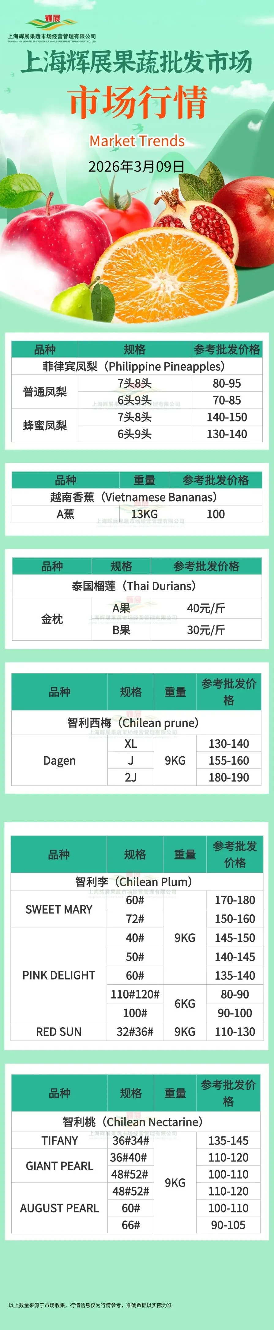 3月09日上海辉展果蔬批发市场行情 | 泰国榴莲、智利西梅、智利李、智利桃等