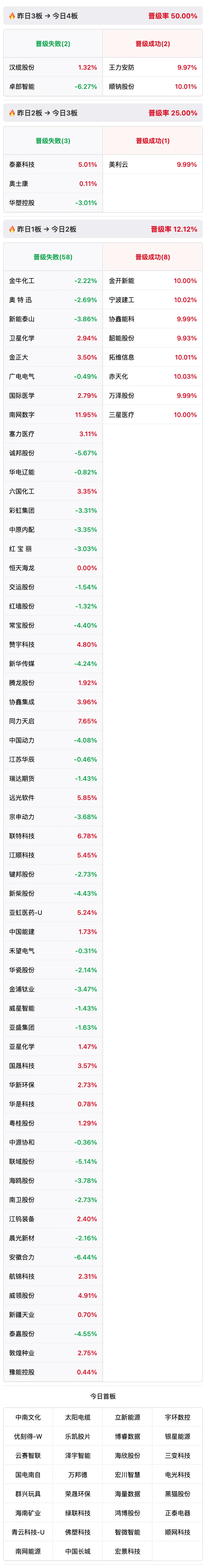 3连板:美利云 2连板:金开新能、协鑫能科、三星医疗、宁波建工 首板:智微智能、青云科技、云赛智联、电光科技、群兴玩具、鸿博股份、宏景科技 | |