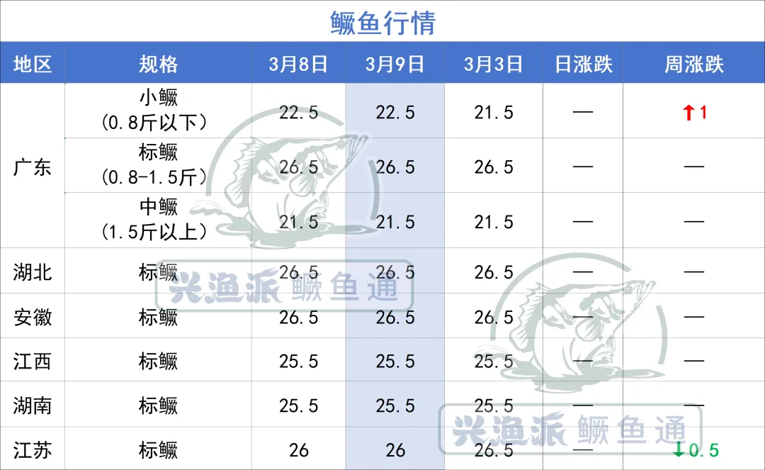 行情速递|3 月 9 日广东小鳜塘头价上涨 1 元 / 斤,短期行情回暖