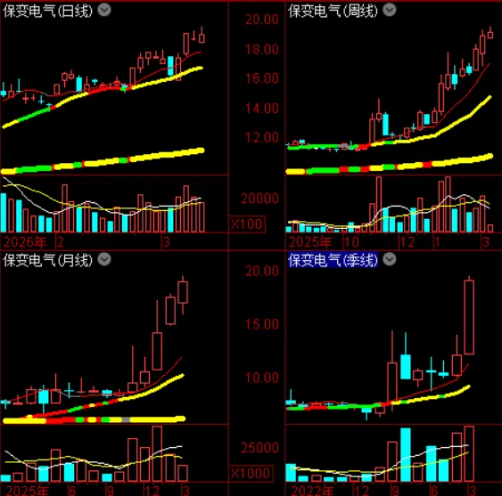 今天保变电气再创新高,日线底部在抬高。日线、周线、月线、季线四个周期全部双黄,表明保变电气中长线仍在主升浪中。