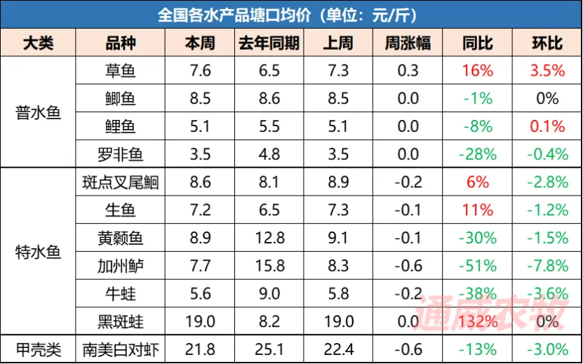 生鱼:上周全国生鱼塘口均价为7.2元/斤,环比-1.2%,同比+11%。