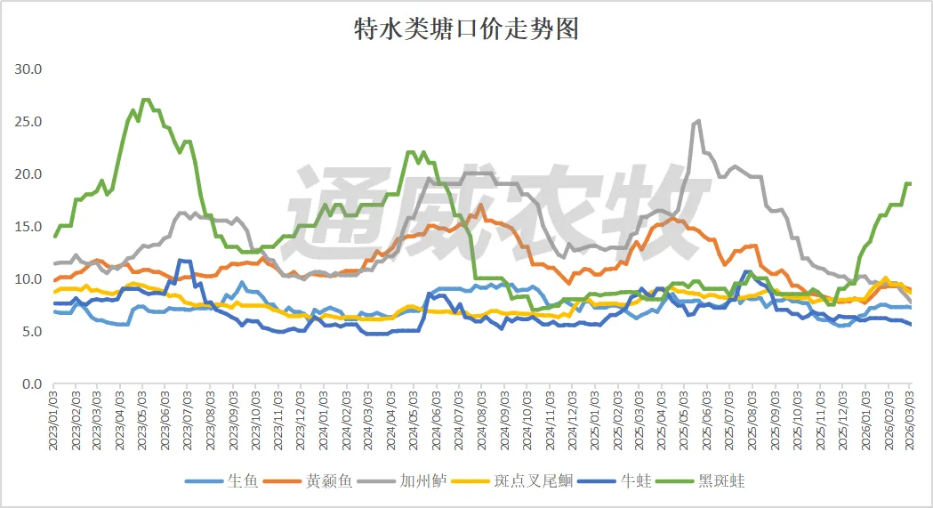 湖北地区因2斤以下小规格鱼存塘占比相对较大,受节后需求减少影响,价格呈现小幅下降趋势,大规格鱼供应偏紧,价格相对稳定。四川地区叉尾陆续发病,价格承压下行,2斤左右规格报价9.2元/斤,较前一周回落0.3元/斤;江门地区受节后需求减少影响,1.5斤价格8.3元/斤,较前一周下跌约0.7元/斤。河南郑州地区2斤价格约9.5元/斤。