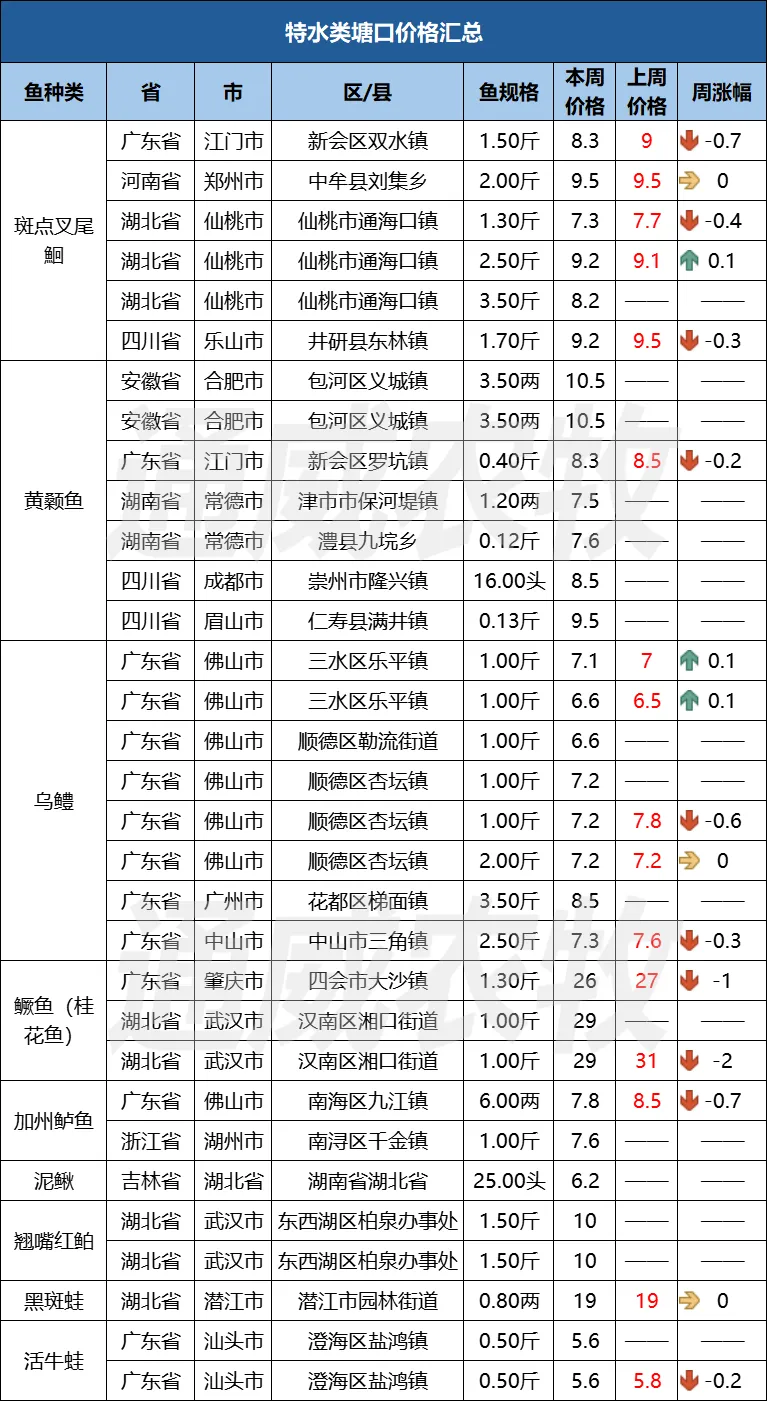 加州鲈主产区受节后需求下降、存塘较大影响,价格延续下行态势。浙江湖州地区1斤价格7.6元/斤,较前一周下跌0.4元/斤;广东佛山地区6两价格约7.8元/斤。